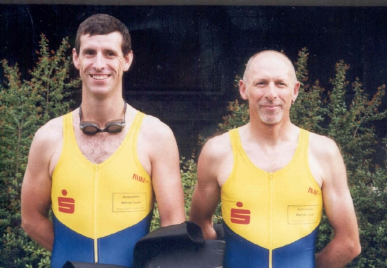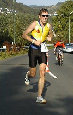 Christian Schindlatz finishte in einer Top-Zeit von 2:24:05 Std. (S.-16:25min, R.-1:32:38Std.,L.-35:02min) auf Gesamtplatz 22, AKM 30 Platz 6. Mit Rainer Breuer und Michael Robert gingen zwei Ironman - Teilnehmer von Hawaii 2003 an den Start. Breuer kam in seiner Altersklasse AK 40 auf Platz 1 in 2:28:32: Std. (S.-19:39min, R.-1:32:48Std. L.-36:05( Gesamtplatz 43) und Robert lief nach 2:32:33 Std. (S.-17:39min, R.-1:36:55Std., L.-37:59) Gesamtplatz 69 und AKM 40 Platz 5 durch Ziel. Frank Nachtsheim, der in diesem Jahr beim Ironman in Frankfurt startet, absolvierte seinen Dreikampf in 2:37:30 Std . (S-18:26min.R.-1:38:37STd.- L.-40:27min.) auf dem 101. Gesamtplatz (AK 35Platz) Bei Seven Büttner, der schon in Mussbach eine respektable Zeit lief, blieb die Stoppuhr nach 2:45:32Std. (17:52min, R.-1:43:04Std. L.-44:36min.) stehen (Gesamtplatz 150, AKM 25 Platz 38). Heinz Hans Werner, Manfred Laux und Lothar Meinert starteten neben der Lotto-Liga-Mannschaft des TriTeam Sinzig im offenen Feld. Hier ihre Ergebnisse: H.W.Heinz 2:46:24Std.(S-18:11min.R.-1:44:56Std., L.-43:17min. /Gesamtplatz 157 / AKM 45 Platz 7; M.Laux 2:46:51Std. (S-20:03min. R.-1:45:13Std., L.-41:35min. Gesamtplatz 157, AK 50 Platz 5; L. Meinert 3:04:33Std. (S.-20:24min., R.-1:52:09Std., L.-52:00min, / Gesamtplatz 256 und AKM Platz 3). | |