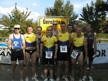 Gerolstein: Weit über 30 Grad Celsius, Sonne pur und keine Wolken, so die Wetterbedingungen für zehn Triathleten von TriTeam Sinzig, die am 17. August 2002 in Gerolstein an den Start gingen. Nach der Mitteldistanz in Simmern musste nun erstmals ein Sprint in der Lotto-Triathlon-Liga in Rheinland-Pfalz bewältigt werden. 500m Schwimmen, 20Km Radfahren in einem teilweise anspruchsvollen Rundkurs sowie zuletzt 5 Km Laufen mit einem 8% Anstieg von ca. 200m zum Schluss führte bei allen Teilnehmern zu einem Wettkampf, wo Schnelligkeit in allen drei Distanzen bei hohem Puls (ab 150 aufwärts) gefordert wurde.