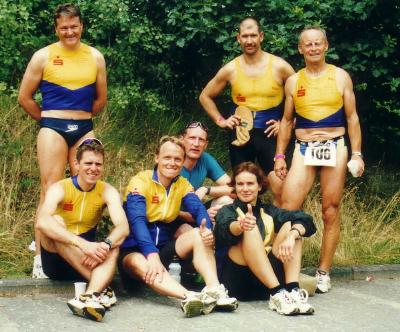 Geschafft. Finisher in der Mitteldistanz mit guten Zeiten: Andre` Schmalz, Christian Schindlatz, Klaus Peter, Thoms Pütz, EvaMaria Birlo, Hans Werner Heinz und Lothar Meinert, (v.l.n.r.) |